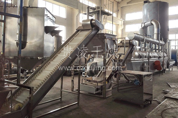 物料自進料口進入機內,在振動力作用下,物料沿水平流化床拋擲,向前連續運動,熱風向上穿過流化床同濕物料換熱后,濕空氣經旋風分離器除塵后由排風口排出,干燥物料由排料口排出。
