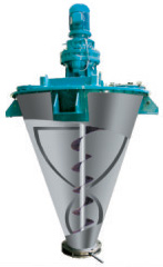 關鍵詞:由擺線針輪減速機連接中心螺桿及外層螺帶以相同轉速轉動。工作時,中心螺桿將混合物料由底部提升到頂部,同時線速度較大的外部螺帶將物料由下而上沿錐形筒壁盤提升,二種運動在離心力作用下又將物料沿切線方向拋向空...