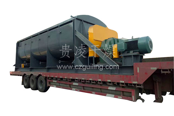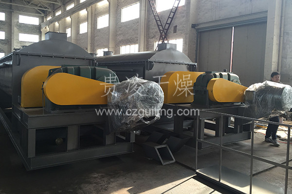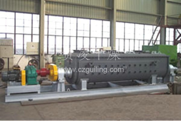 空心軸上密集排列著楔型中空槳葉,熱介質經空心軸流經槳葉。單位有效容積內傳熱面積很大,熱介質溫度從-40℃到320℃,可以是水蒸汽,也可以是液體型:如熱水、導熱油等。間接傳導加熱,沒有攜帶空氣帶走熱量,熱量均用來加熱物料。熱量損失僅為通過器體保溫層向環境的散熱。楔型 槳葉傳熱面具有自清潔功能。物料顆粒與楔型面的相對運動產生洗刷作用,能夠洗刷掉楔型面上附著物料,使運轉中一直保持著清潔的傳熱面。槳葉干燥機的殼體為W型,殼體內一般安排二到四根空心攪拌軸。殼體有密封端蓋與上蓋,防止物料粉塵外泄及收集物料溶劑蒸汽。出料口處設置一擋扳,保證料位高度,使傳熱面被物料覆蓋而充分發揮作用。熱介質通過旋轉接頭,流經殼體夾套及空心攪拌軸,空心攪拌軸依據熱介質的類型而具有不同的內部結構,以保證好的傳熱效果。
